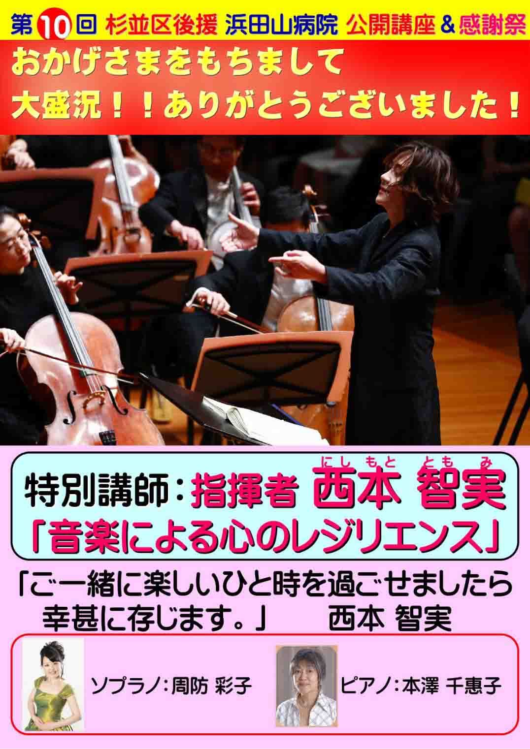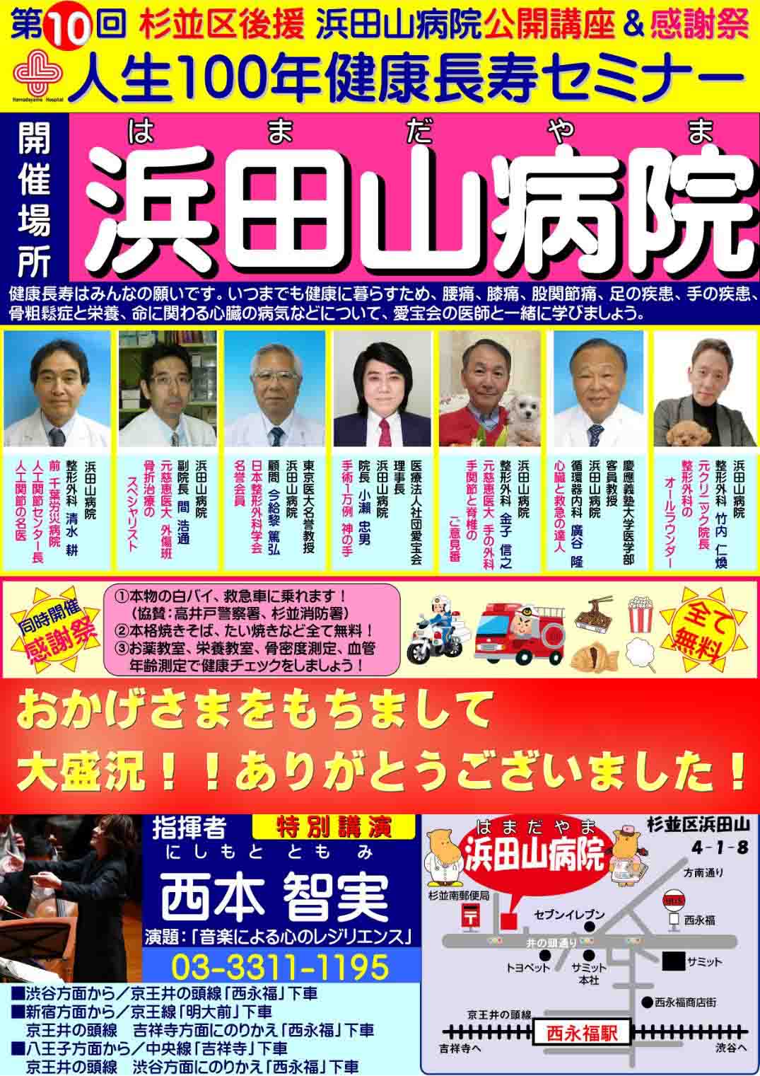 杉並区後援の第10回公開講座が11月24日に開催されました。地域の皆様の健康を願い、各医師の人生100年健康長寿セミナー、TVでおなじみの指揮者.西本智実さまの特別公演、高井戸警察署の白バイ体験や防犯.交通教室、杉並消防署の消防車体験や防火.防災教室ともタイアップし、同時開催の愛宝会10周年感謝祭イベントに、ご来院数も、過去最大の460名を記録し大盛況でした。ひとえに職員一同が地域の方々の健康を願って他医療機関にはない形の社会貢献ができたことをうれしくおもいます。これからも益々愛宝会グループは地域のみなさまの健康をお守りし頑張っていきます。